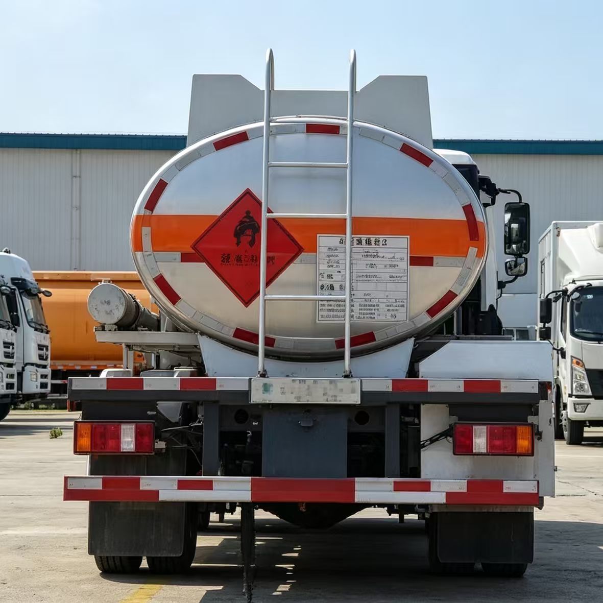Core Components:Static grounding alarm, anti-overflow sensor, fire extinguisher, emergency shut-off device, vapor recovery port, warning signs. Functions:Eliminate static electricity, prevent overflow and leakage, cut off risk sources, and meet warning requirements for hazardous chemicals transportation.